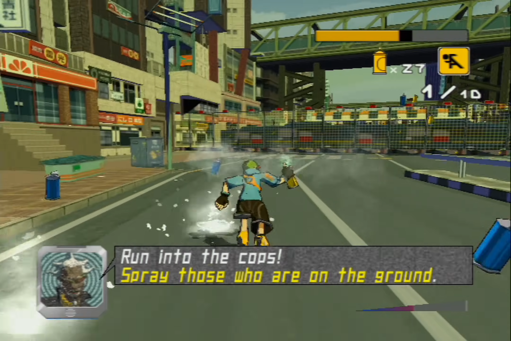 This is the world of Jet Set Radio Future. An alternate reality remake of the original Jet Set Radio, which was called Jet Grind Radio in the US, it’s a game about a group of young skaters in a gently futuristic version of Tokyo. The skaters move through the game’s cluttered cityscapes with grace and speed – they’re super-users of the urban environment – and they lay down graffiti to mark their territory. In the game’s fiction, their city is in danger from the authoritarian Rokkaku Group and its private police force. This group wants to outlaw skating and graffiti, but it’s effortlessly clear that what it’s really targeting is freedom of expression. And so a battle unlike any other in video games is about to play out. And once again, radio is the heartbeat of this universe.